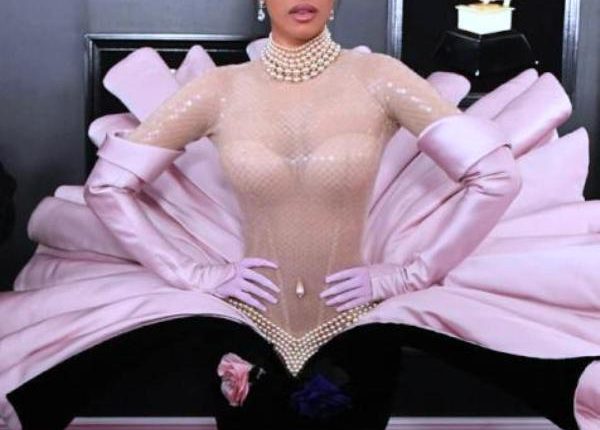 اطلالة كاردي بي Cardi B كانت الأغرب في حفل الغرامي، حيث اختارت فستان فنتج يعود لعام 1995 من دار موغلر Mugler بدا تصميمه مثل الزهرة المتفتّحة من الأعلى، وقد زينته حبات اللؤلؤ عند الورك والياقة، وقد نسقت معه قفازات طويلة واكسسوار شعر من اللؤلؤ أيضًا.
