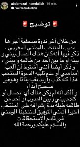 وأتم “أخيرا أتمنى التوفيق لمنتخبنا الوطني في قادم الاستحقاقات، والسلام عليكم ورحمة الله”.