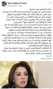 النصيحة المرفقة، حرفيا وبالتاريخ والصورة، كان فحواها تصويبا لتصريح ساذج، صادر عن سفيرة معينة لتوها، استبعدت، كما قالت حينها الخوض في المسائل السياسية، وأنها ستنكب على الجوانب الاقتصادية والثقافية، جهْلا منها أو تجاهُلا -في أحسن الحالات- أن هناك قناصلة دورُهم هو ما زعَمَتْه، وأن دورها كممثل دبلوماسي أول لبلادها في تلك البلاد، هو التحرك على كافة الأصعدة، وعلى رأسها الجانب السياسي والدبلوماسي، بينما في الجوانب الأخرى تكتفي بدور الموجّه فقط والمشرف..